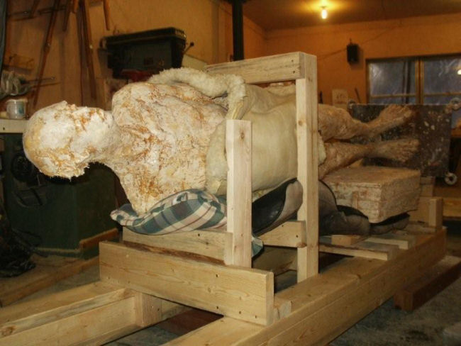 The day Frank was installed was probably the coldest day of the whole year. It was close to minus 20 C the whole day making for some very cold fingers and toes on the part of the people who were helping Michael install Frank. Many thanks go to Edd Anderson and Glenn Clark for their tireless efforts in this regard. Contrary to what was reported in the newspapers The Baggage Handler was installed with the metal plate already covering the genitalia. The controversy came about when many were offended by the mayor’s decision to force the coverage of Frank’s private parts. This is what sparked the debate in city hall. |