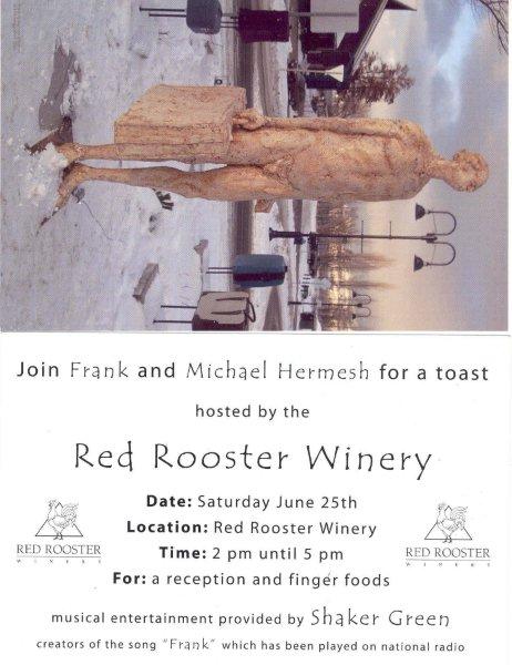 After Frank was restored he was placed on display at the Red Rooster Winery. There was a party held to celebrate his return that many of the local dignitaries attended. Many of the neighbors placed luggage at the foot of their driveway to show their support of Frank. The winery honored Frank by creating a "Cabernet Frank" wine. The wine label went on to win the Peoples Choice award at the fall wine festival. The wine itself sold out within 6 weeks of its release. The artist signed every bottle.